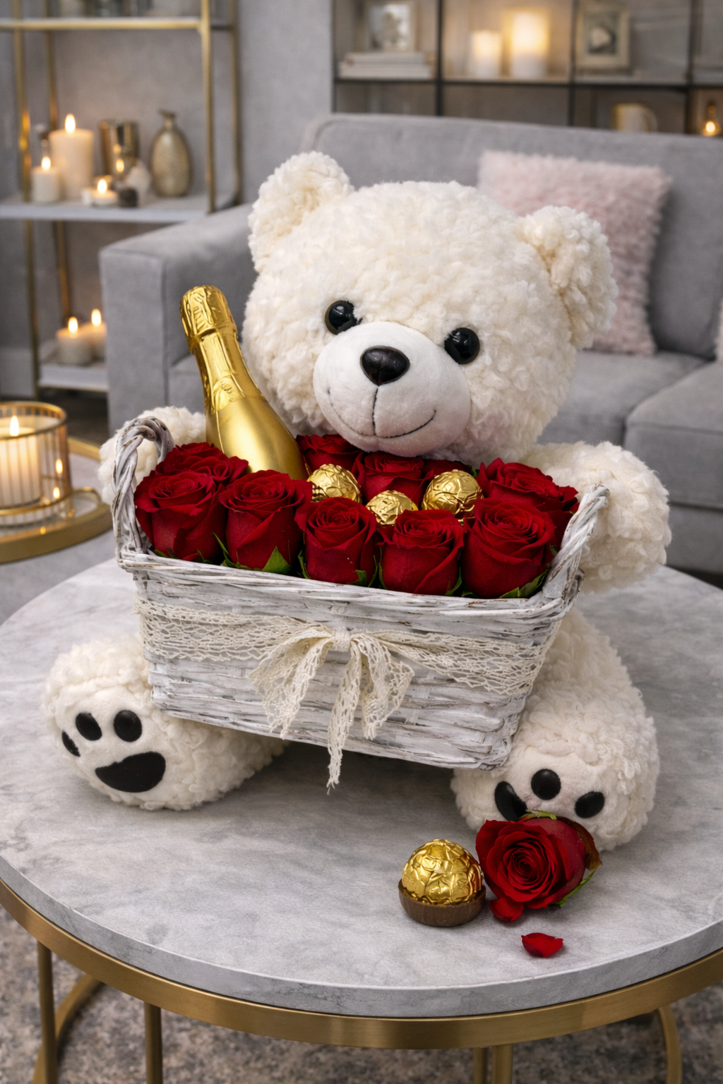 🤍 Coș Love cu Ursuleț, Trandafiri & Șampanie 🤍