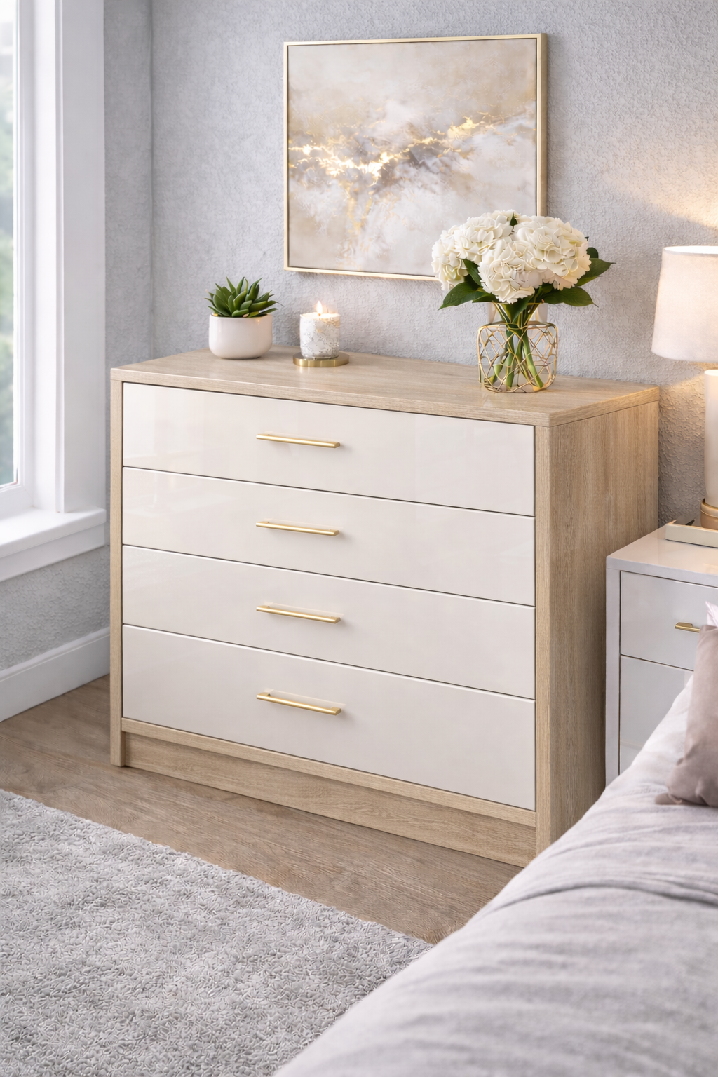 Comodă modernă cu design elegant, realizată din PAL melaminat de calitate pentru carcasă, ce oferă rezistență și stabilitate în timp. Fronturile sunt fabricate din MDF lucios, finisaj premium, cu suprafață perfect netedă și efect reflectant, ce adaugă un plus de rafinament și lumină încăperii.