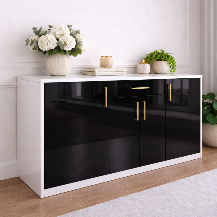 Adaugă un plus de eleganță locuinței tale cu această comodă modernă, ideală pentru living, dormitor sau hol. Modelul Cris impresionează prin contrastul dintre carcasa albă și fronturile negre din MDF lucios, evidențiate de mânerele metalice aurii, care oferă un accent rafinat și un aer sofisticat.