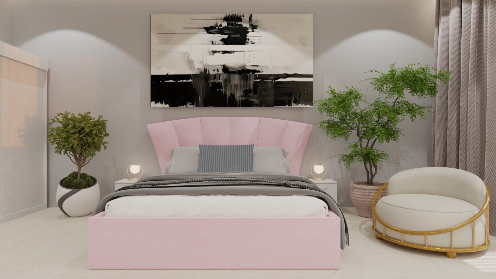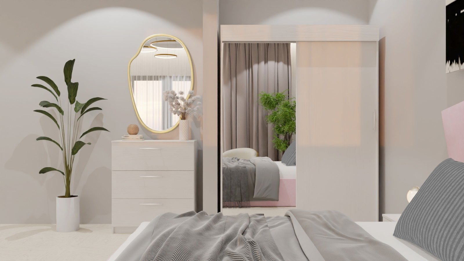 Dormitor Lucas Tapitat Roz 2 Usi Alb cu Oglinda