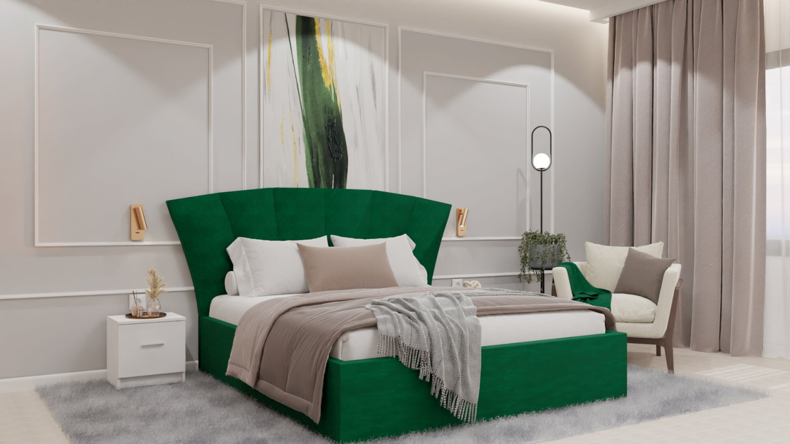 Dormitor Lucas cu Pat Tapitat Stofa Verde cu dulap 200*200 usi glisante Sonoma&Alb , noptiere si comoda