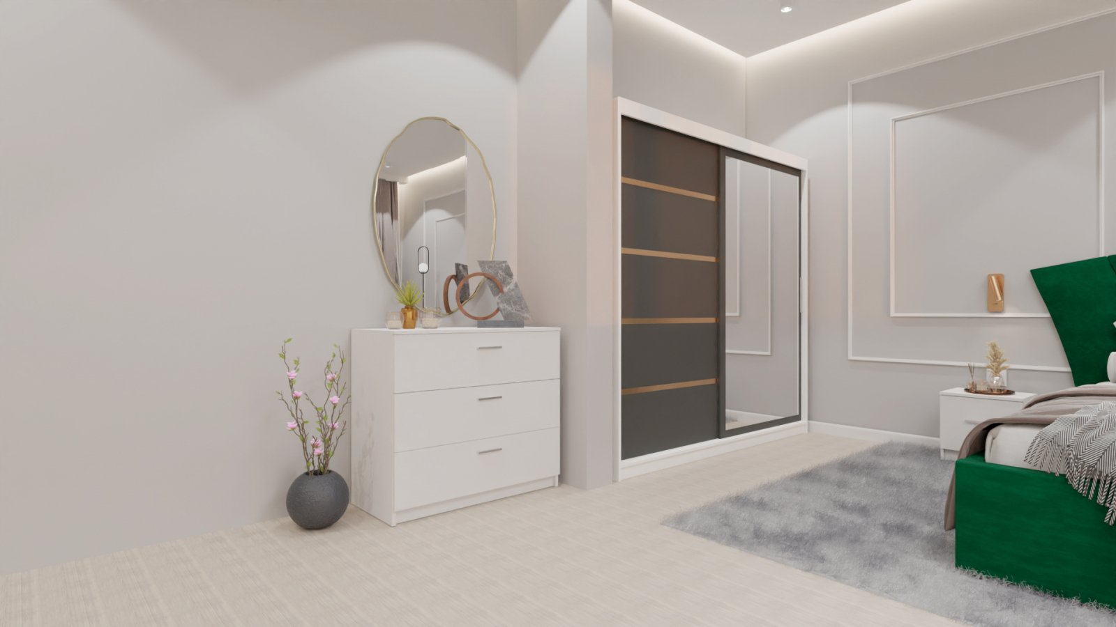 Dormitor Lucas cu Pat Tapitat Stofa Verde cu dulap 200*200 usi glisante Antracit&Alb cu oglinda , noptiere si comoda