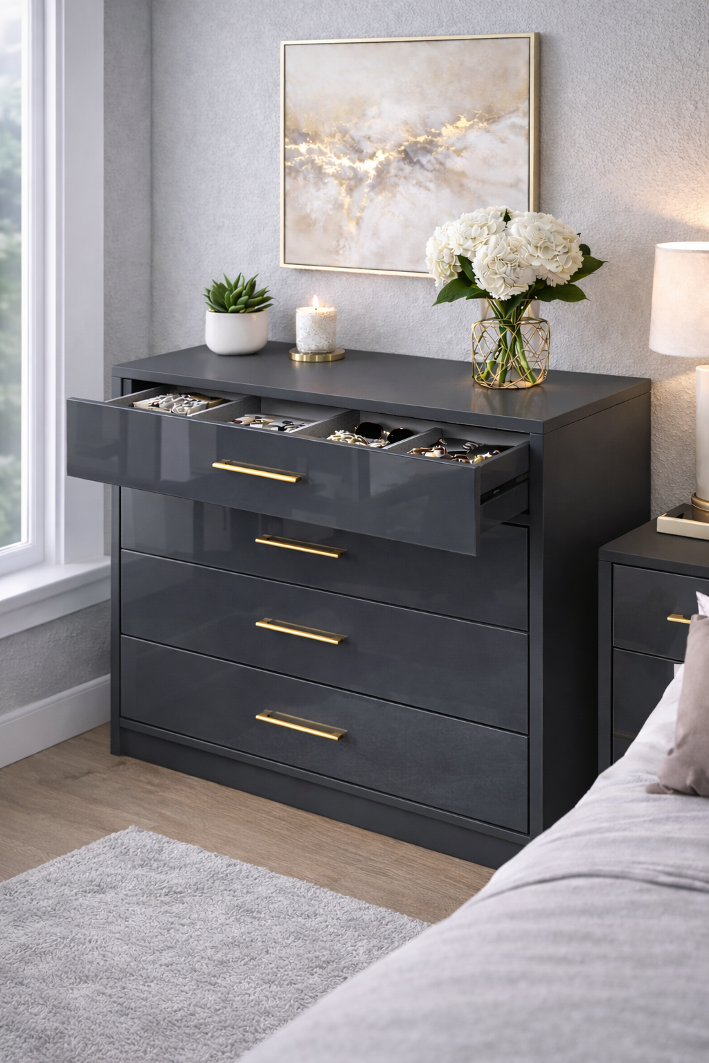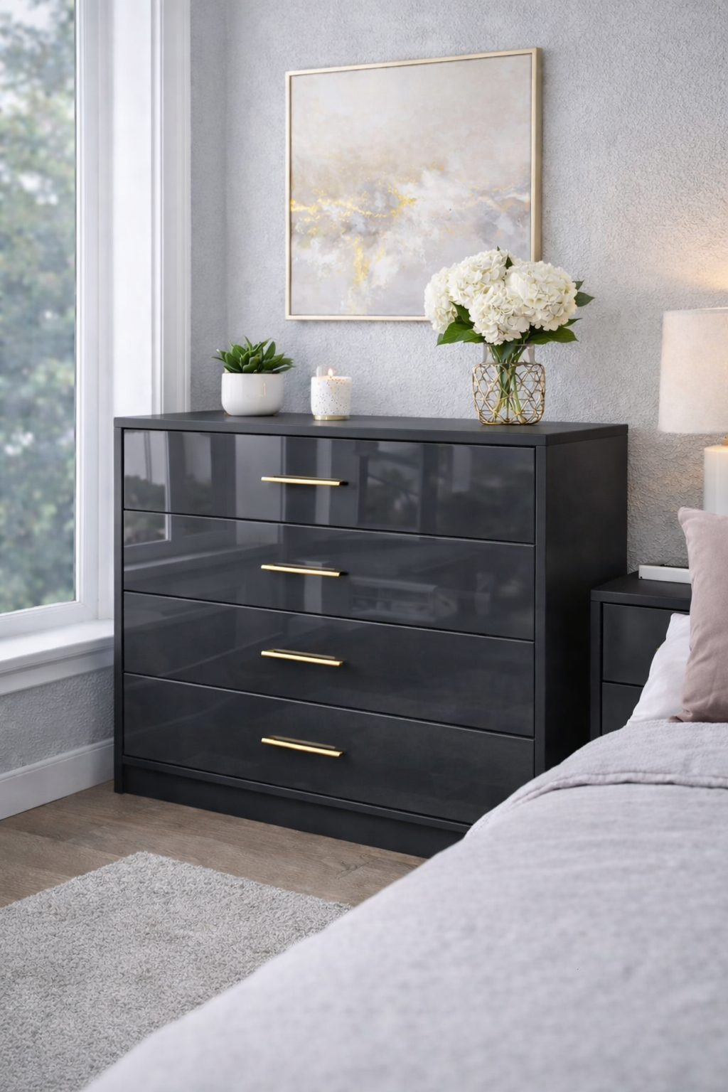 Comodă modernă cu design elegant, realizată din PAL melaminat de calitate pentru carcasă, ce oferă rezistență și stabilitate în timp. Fronturile sunt fabricate din MDF lucios, finisaj premium, cu suprafață perfect netedă și efect reflectant, ce adaugă un plus de rafinament și lumină încăperii.