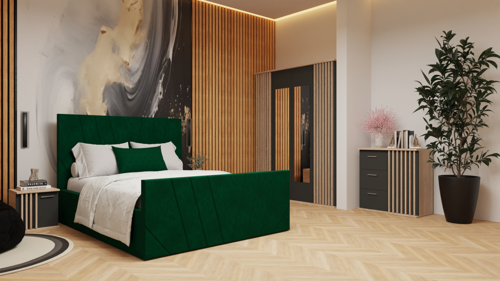Dormitor Dallas Cu Pat Tony Tapitat Verde