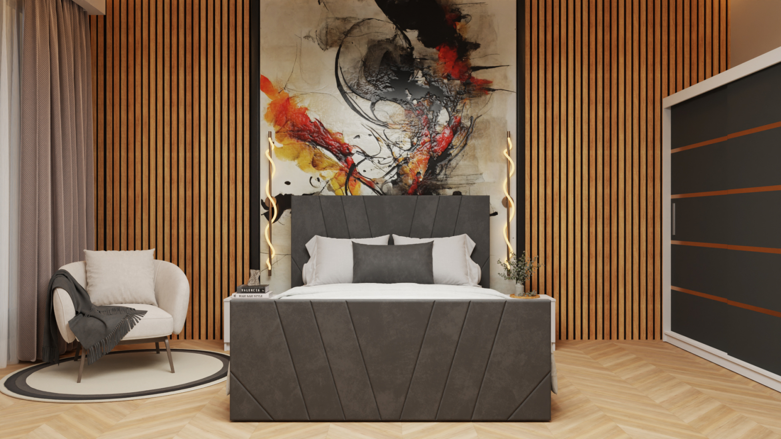Dormitor Tony Tapitat Stofa Gri cu dulap 200*200 usi glisante Alb&Antracit, noptiere si comoda