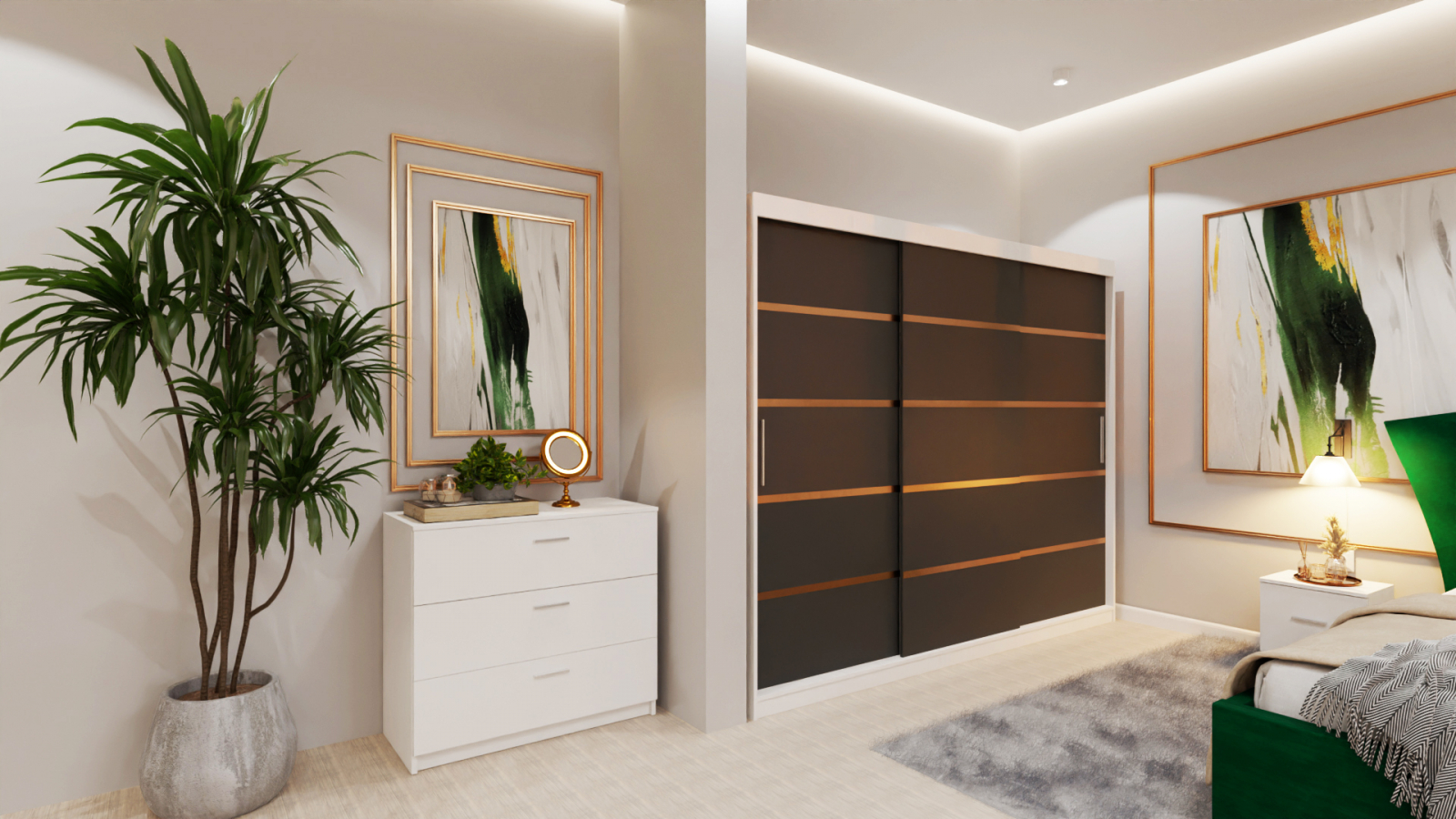 Dormitor Lucas Tapitat Stofa Verde cu dulap 250*200 usi glisante Alb&Antracit, noptiere si comoda