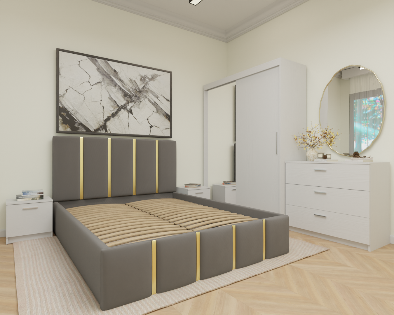 Dormitor MILANO cu Pat Tapitat Stofa cu dulap usi glisante Alb cu oglinda, noptiere si comoda