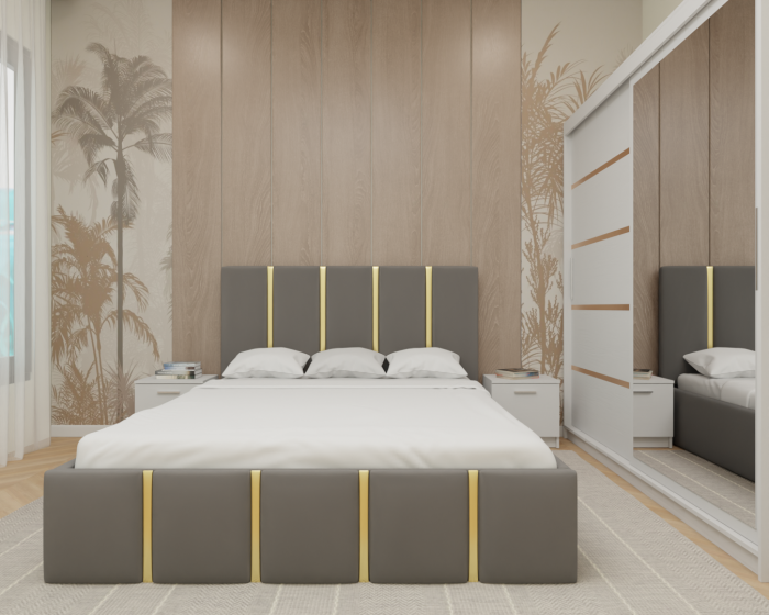 Dormitor MILANO Tapitat, 200X200 Alb cu oglinda, Somiera Rabatabila