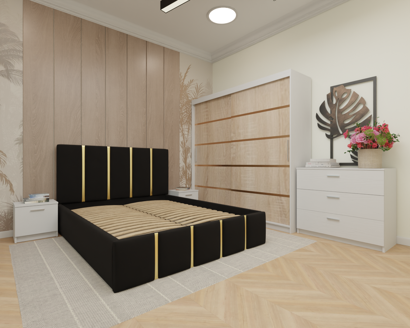 Dormitor MILANO Tapitat, 200X200 Alb&Sonoma fara oglinda, Somiera Rabatabila