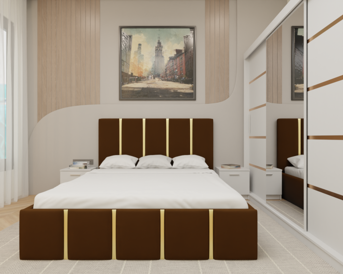Dormitor MILANO Tapitat, 250X200 Alb cu oglinda, Somiera Rabatabila
