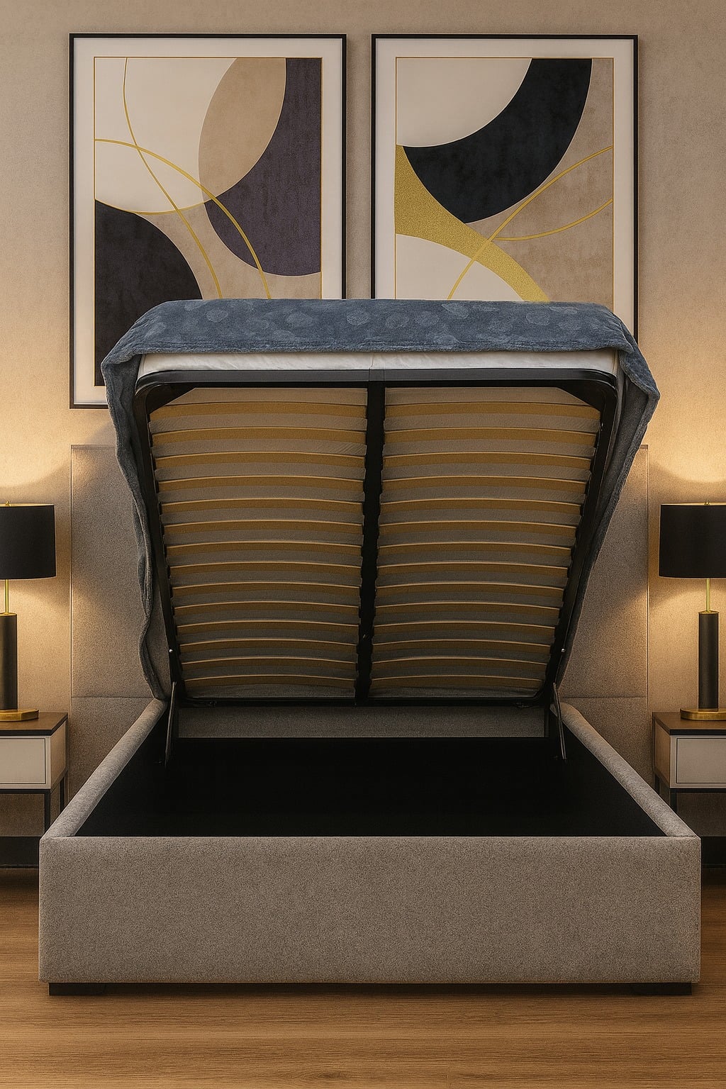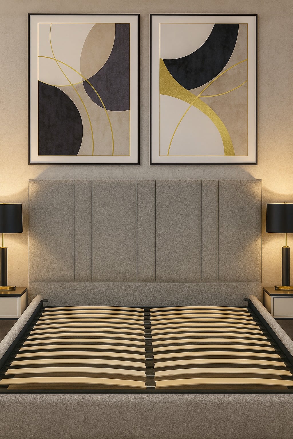 Acest pat tapițat impresionează prin designul modern și materialele de înaltă calitate,