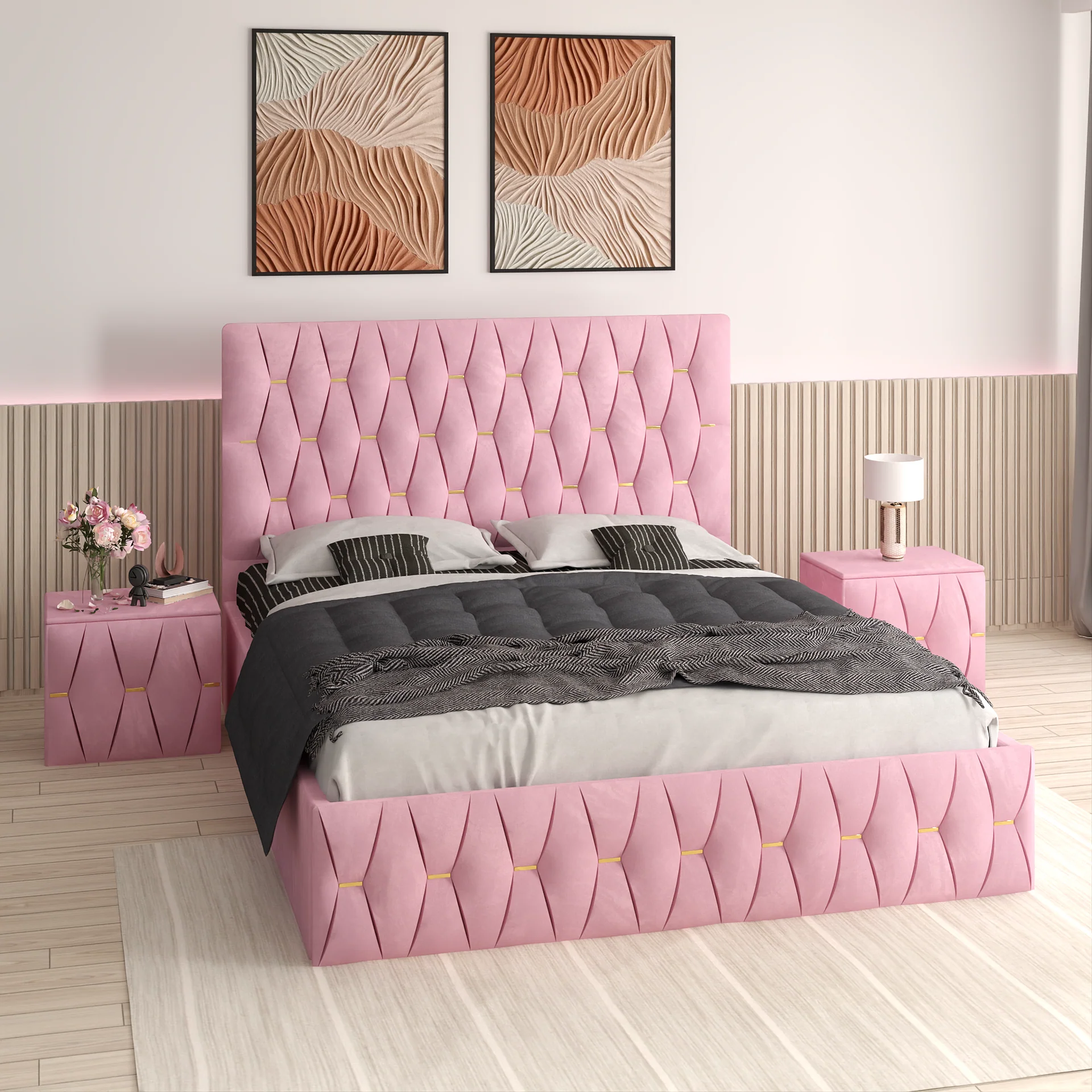 este un pat modern și elegant, cu tapițerie fină, detalii geometrice și accente aurii ce oferă un aer sofisticat dormitorului. Tablia mare a patului asigură confort sporit, iar structura solidă garantează durabilitate.