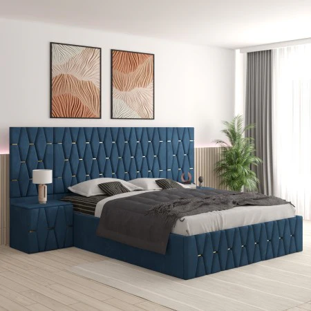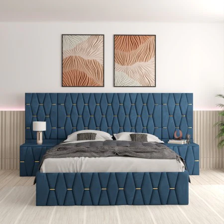 Patul Monaco dublu este un pat modern și elegant, cu tapițerie fină, detalii geometrice și accente aurii ce oferă un aer sofisticat dormitorului. Tablia mare a patului asigură confort sporit, iar structura solidă garantează durabilitate.