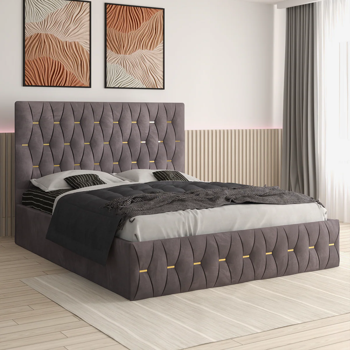 este un pat modern și elegant, cu tapițerie fină, detalii geometrice și accente aurii ce oferă un aer sofisticat dormitorului. Tablia mare a patului asigură confort sporit, iar structura solidă garantează durabilitate.
