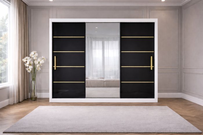 Dressingul Georgia din MDF lucios aduce un plus de eleganță și luminozitate în orice dormitor. Finisajul lucios reflectă frumos lumina, oferind încăperii un aspect mai spațios și rafinat, iar liniile aurii decorative completează perfect designul sofisticat. Sistemul de glisare asigură funcționalitate și economie de spațiu.