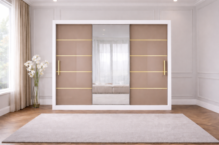 Dressingul Georgia din MDF lucios aduce un plus de eleganță și luminozitate în orice dormitor. Finisajul lucios reflectă frumos lumina, oferind încăperii un aspect mai spațios și rafinat, iar liniile aurii decorative completează perfect designul sofisticat. Sistemul de glisare asigură funcționalitate și economie de spațiu.
