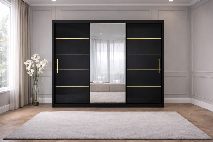 Dressingul Georgia din MDF lucios aduce un plus de eleganță și luminozitate în orice dormitor. Finisajul lucios reflectă frumos lumina, oferind încăperii un aspect mai spațios și rafinat, iar liniile aurii decorative completează perfect designul sofisticat. Sistemul de glisare asigură funcționalitate și economie de spațiu.