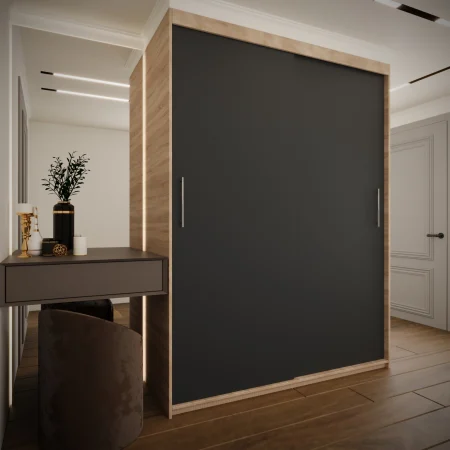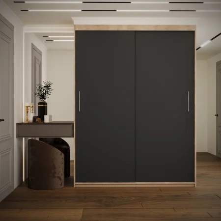 Acest dressing este o soluție practică și elegantă pentru organizarea hainelor și accesoriilor, fiind potrivit atât pentru dormitor, cât și pentru hol. Sistemul de uși culisante ajută la economisirea spațiului și oferă un acces facil la interiorul dressingului.