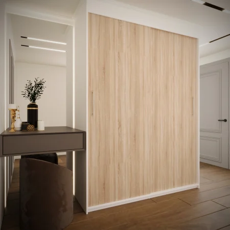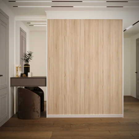 Acest dressing este o soluție practică și elegantă pentru organizarea hainelor și accesoriilor, fiind potrivit atât pentru dormitor, cât și pentru hol. Sistemul de uși culisante ajută la economisirea spațiului și oferă un acces facil la interiorul dressingului.