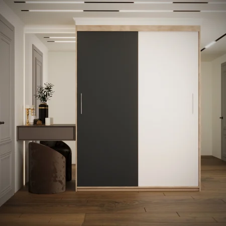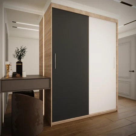 Acest dressing este o soluție practică și elegantă pentru organizarea hainelor și accesoriilor, fiind potrivit atât pentru dormitor, cât și pentru hol. Sistemul de uși culisante ajută la economisirea spațiului și oferă un acces facil la interiorul dressingului.