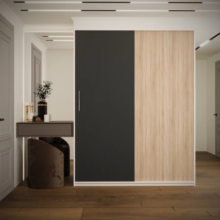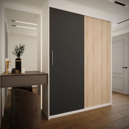 Acest dressing este o soluție practică și elegantă pentru organizarea hainelor și accesoriilor, fiind potrivit atât pentru dormitor, cât și pentru hol. Sistemul de uși culisante ajută la economisirea spațiului și oferă un acces facil la interiorul dressingului.