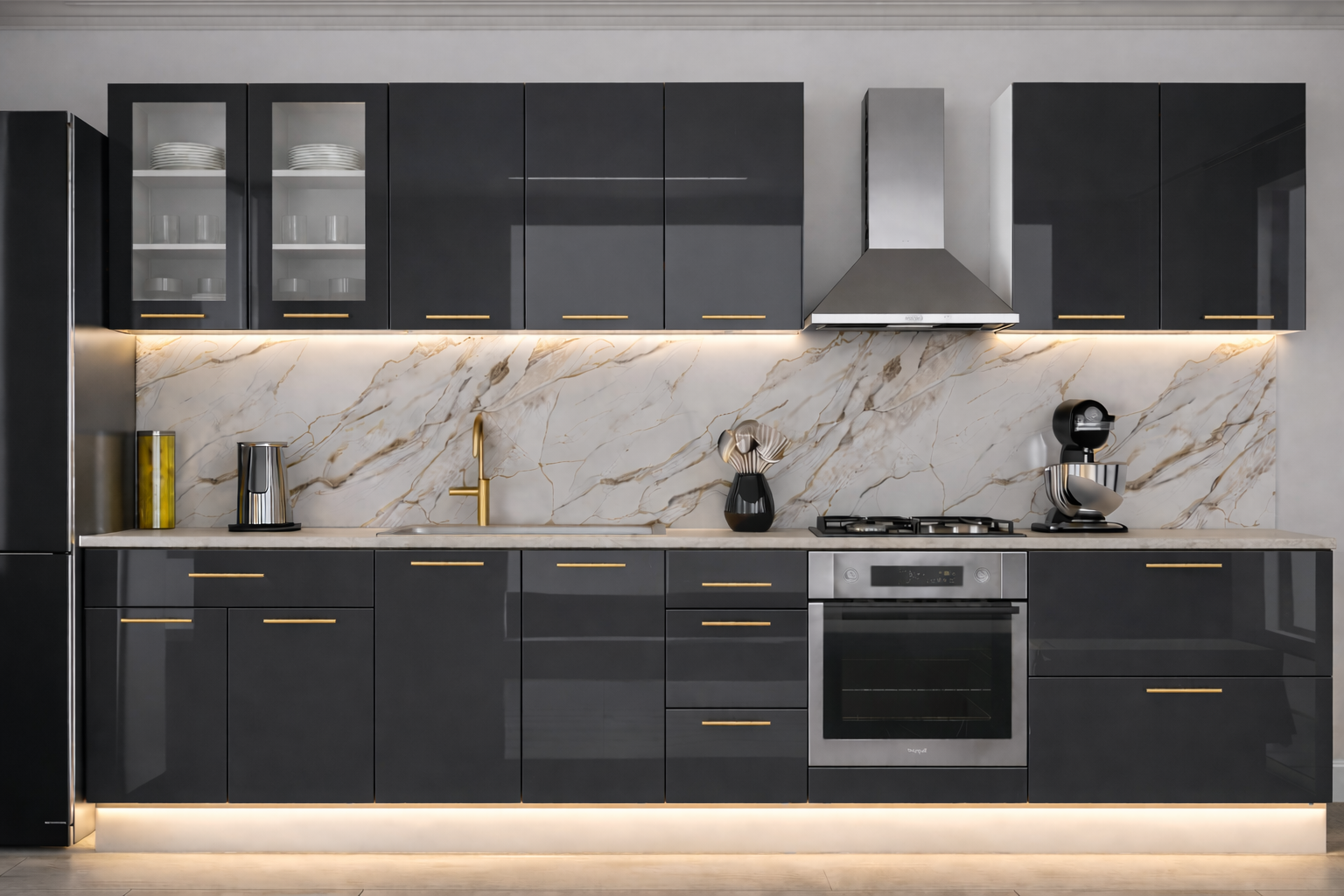 Bucătăria Lucia 3.4m este alegerea ideală pentru un spațiu modern, elegant și funcțional. Designul contemporan îmbină armonios finisajele lucioase cu accentele moderne, oferind un aspect premium și ușor de întreținut. Carcasa este realizată din PAL rezistent, iar fronturile sunt din MDF lucios, ceea ce conferă durabilitate și un aspect rafinat.