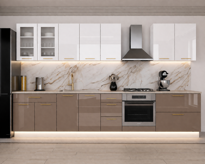 Bucătăria Lucia 3.4m este alegerea ideală pentru un spațiu modern, elegant și funcțional. Designul contemporan îmbină armonios finisajele lucioase cu accentele moderne, oferind un aspect premium și ușor de întreținut. Carcasa este realizată din PAL rezistent, iar fronturile sunt din MDF lucios, ceea ce conferă durabilitate și un aspect rafinat.