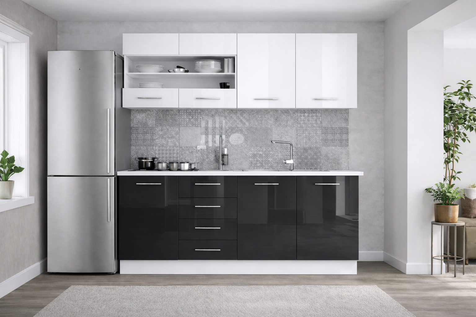 Transformă-ți locuința cu o bucătărie din MDF  lucioasa, perfectă pentru un decor modern și luminos. Finisajul lucios oferă un aspect premium, mărește vizual spațiul și se curăță rapid, fiind ideal pentru utilizare zilnică. Mobilierul este rezistent, practic și bine compartimentat, pentru o organizare eficientă a tuturor ustensilelor.