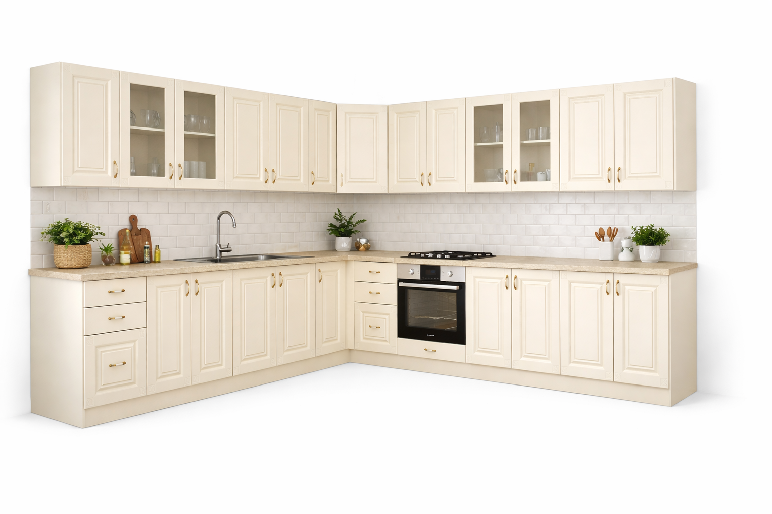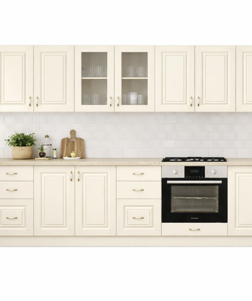 Daca spatiul tau se rezuma la 200 x (90x60 colt) x 260 cm si esti un iubitor al culorii crem, noi iti recomandam mobila de bucatarie Roma Colt 1!