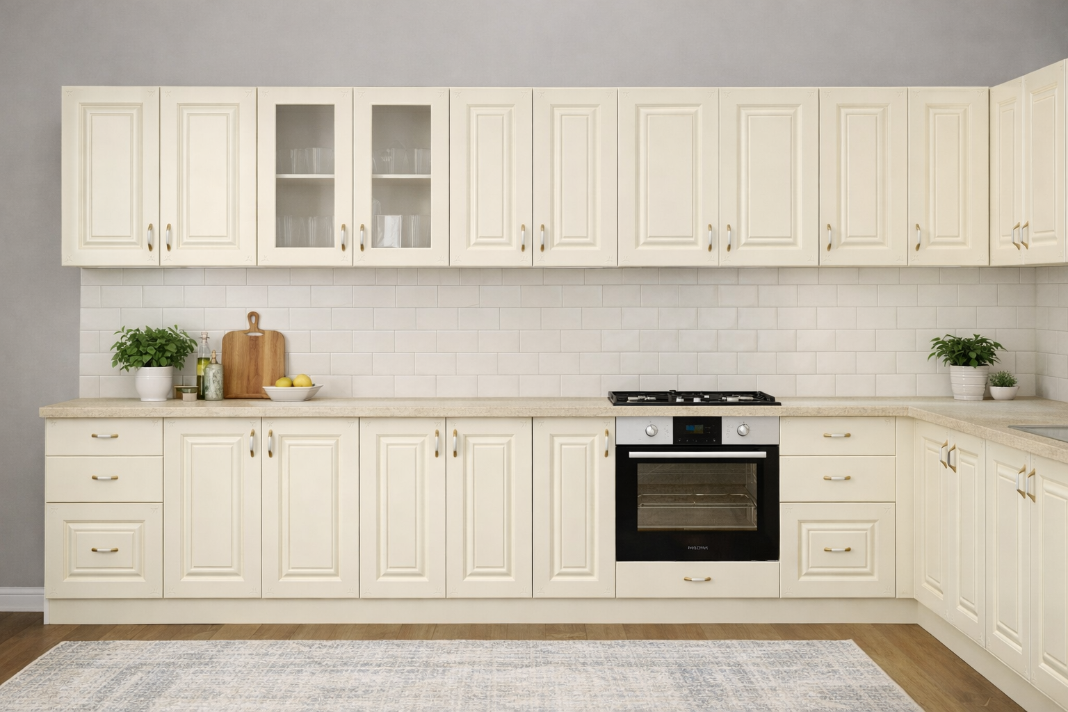 Daca spatiul tau se rezuma la 260 x (90x60 colt) x 260 cm si esti un iubitor al culorii crem, noi iti recomandam mobila de bucatarie Roma Colt 2!