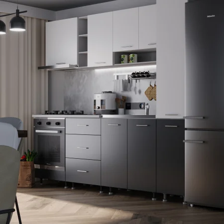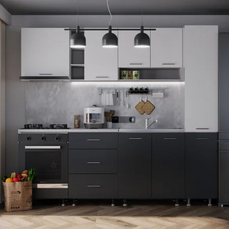 Daca spatiul tau se rezuma la 240cm si esti un iubitor al culorii Antracit, noi iti recomandam mobila de bucatarie Sena!