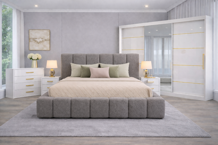 SET DORMITOR  DIN MDF LUCIOS CU DULAP DE 250X 200CM , 2NOPTIERE, COMODA SI PAT TAPITAT CU SOMIERA RABATABILA SI LADA DE DEPOZITARE