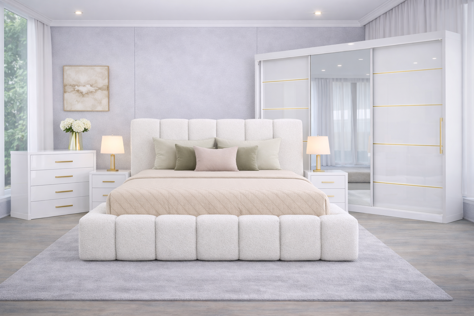 SET DORMITOR DIN MDF LUCIOS CU DULAP DE 250X 200CM , 2NOPTIERE, COMODA SI PAT TAPITAT CU SOMIERA RABATABILA SI LADA DE DEPOZITARE