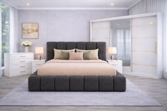 SET DORMITOR DIN MDF LUCIOS CU DULAP DE 250X 200CM , 2NOPTIERE, COMODA SI PAT TAPITAT CU SOMIERA RABATABILA SI LADA DE DEPOZITARE