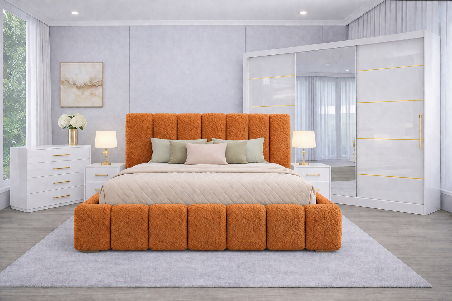 SET DORMITOR  DIN MDF LUCIOS CU DULAP DE 250X 200CM , 2NOPTIERE, COMODA SI PAT TAPITAT CU SOMIERA RABATABILA SI LADA DE DEPOZITARE