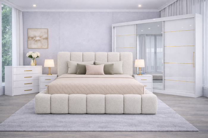 SET DORMITOR  DIN MDF LUCIOS CU DULAP DE 250X 200CM , 2NOPTIERE, COMODA SI PAT TAPITAT CU SOMIERA RABATABILA SI LADA DE DEPOZITARE