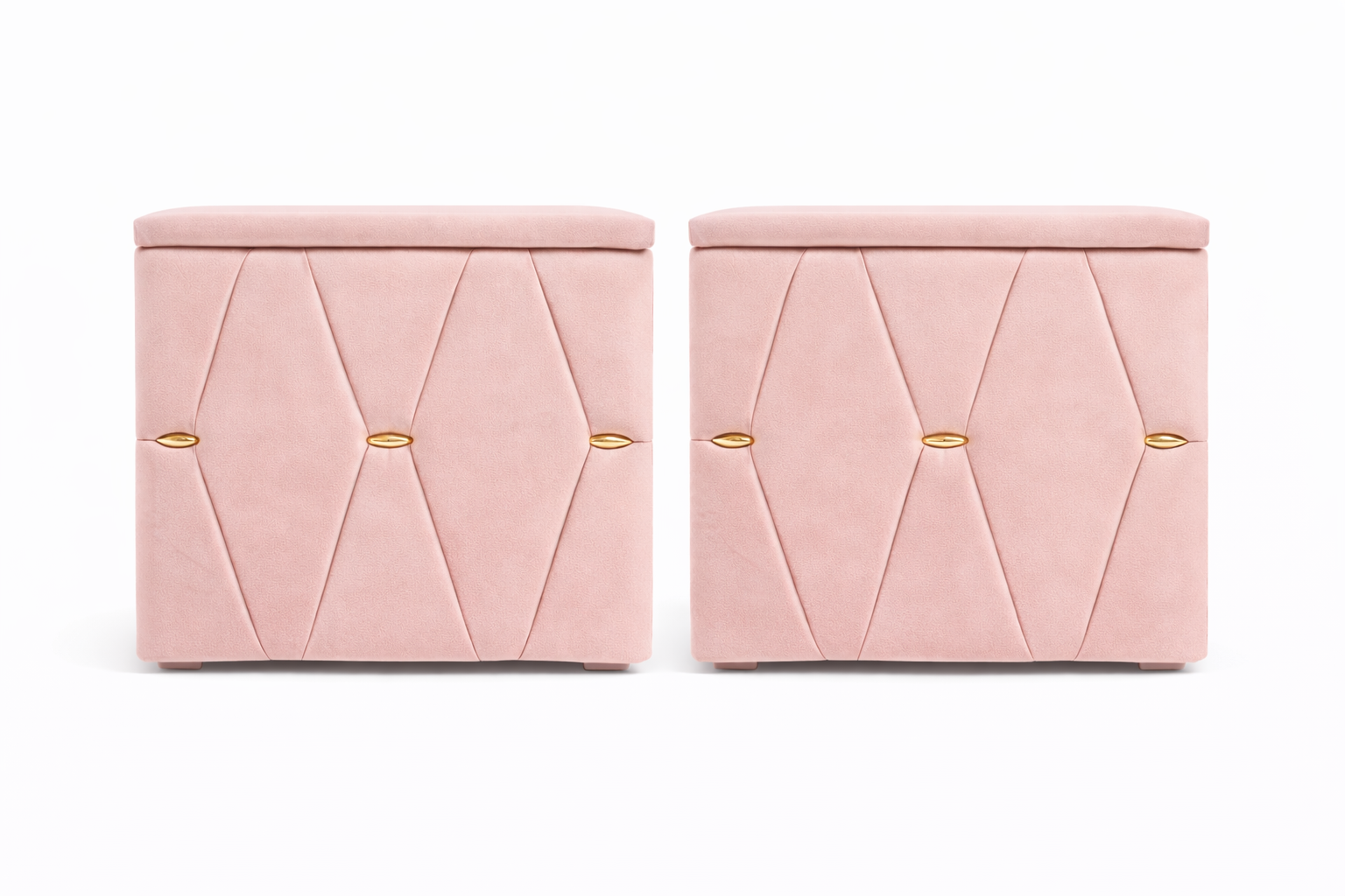Elegante și rafinate, aceste noptiere tapițate cu stofă de înaltă calitate adaugă un plus de stil oricărui dormitor. Modelul geometric decorativ și accentele metalice aurii oferă un aspect sofisticat, iar structura solidă garantează durabilitate în timp.