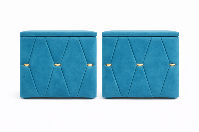 Elegante și rafinate, aceste noptiere tapițate cu stofă de înaltă calitate adaugă un plus de stil oricărui dormitor. Modelul geometric decorativ și accentele metalice aurii oferă un aspect sofisticat, iar structura solidă garantează durabilitate în timp.