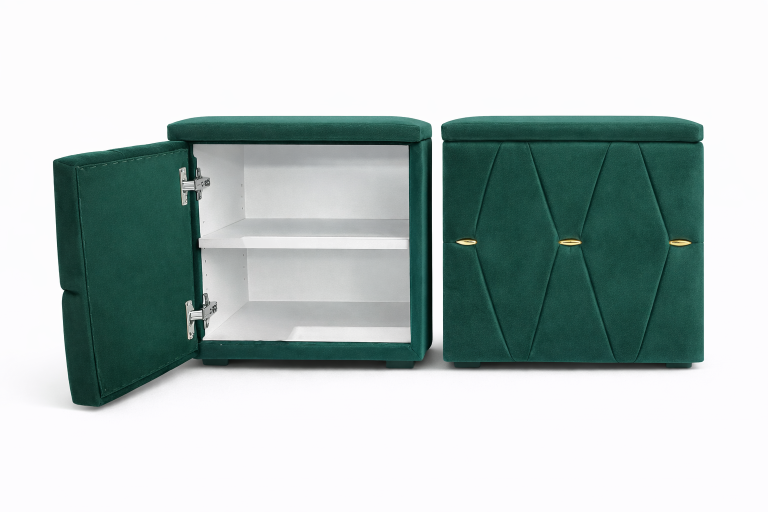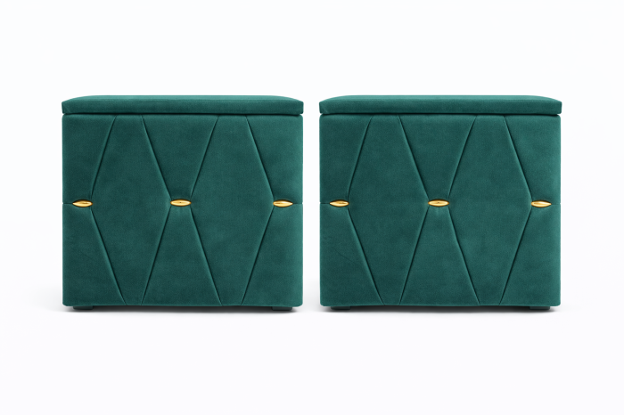 Elegante și rafinate, aceste noptiere tapițate cu stofă de înaltă calitate adaugă un plus de stil oricărui dormitor. Modelul geometric decorativ și accentele metalice aurii oferă un aspect sofisticat, iar structura solidă garantează durabilitate în timp.