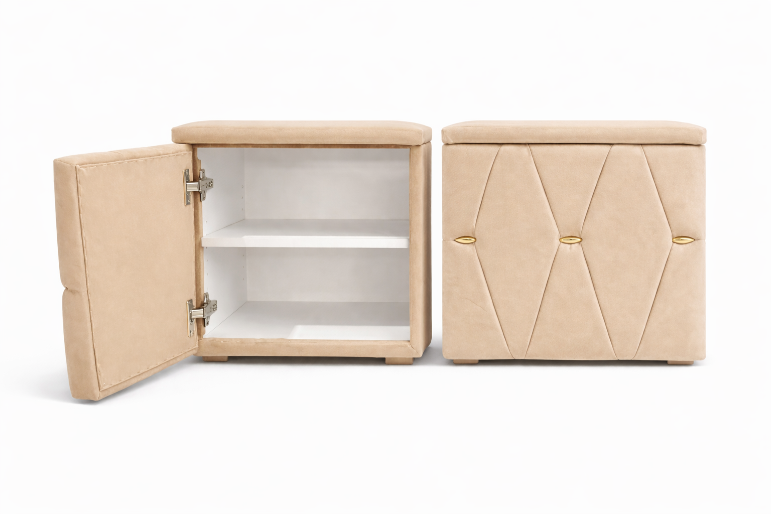 Elegante și rafinate, aceste noptiere tapițate cu stofă de înaltă calitate adaugă un plus de stil oricărui dormitor. Modelul geometric decorativ și accentele metalice aurii oferă un aspect sofisticat, iar structura solidă garantează durabilitate în timp.