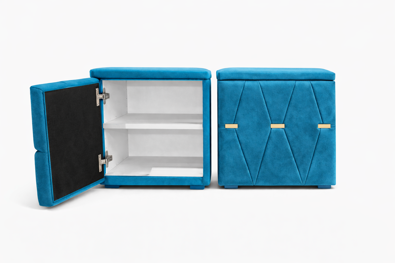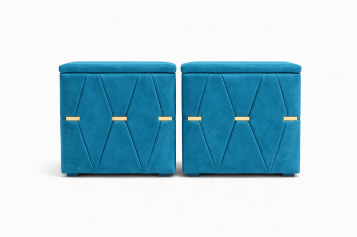 Elegante și rafinate, aceste noptiere tapițate cu stofă de înaltă calitate adaugă un plus de stil oricărui dormitor. Modelul geometric decorativ și accentele metalice aurii oferă un aspect sofisticat, iar structura solidă garantează durabilitate în timp.
