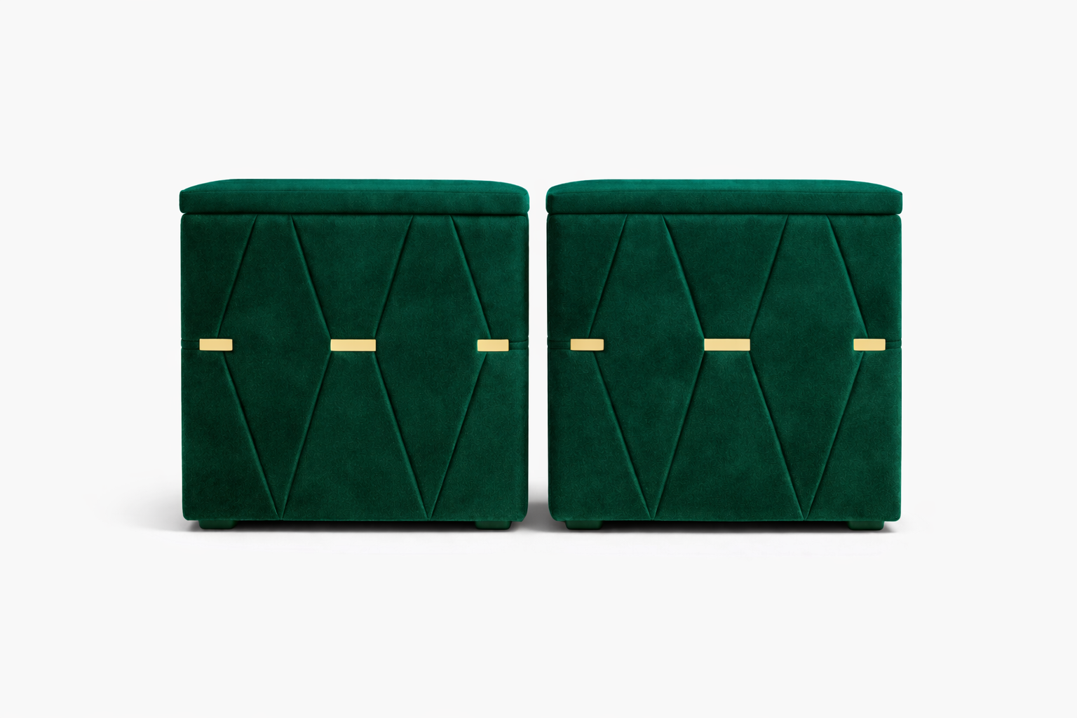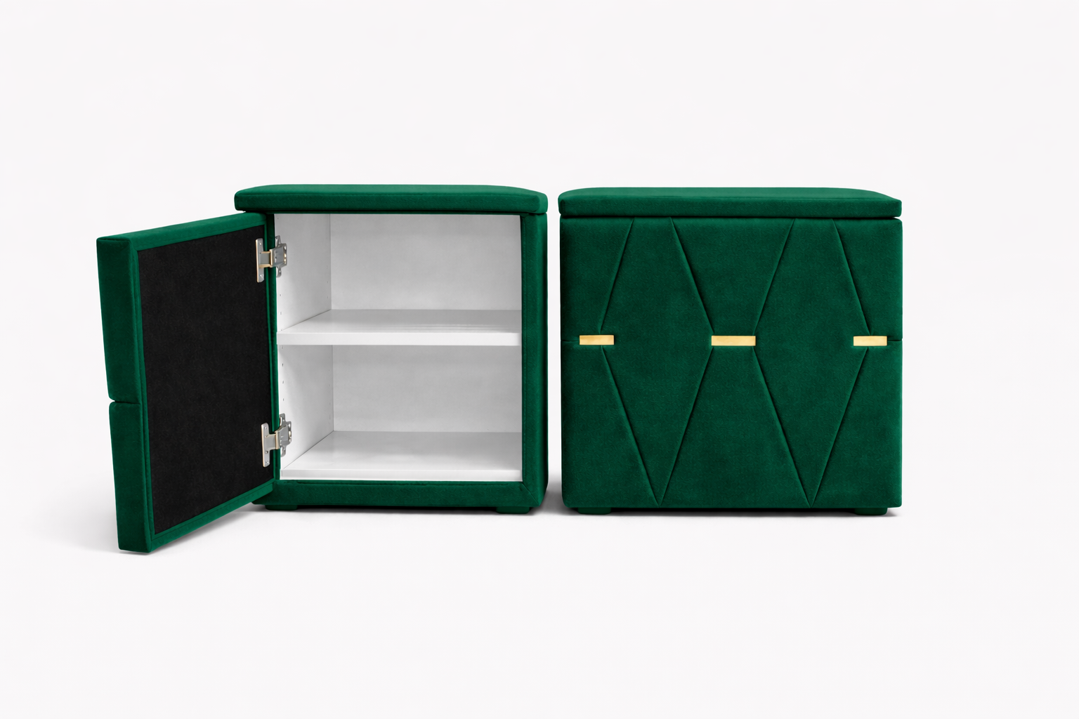 Elegante și rafinate, aceste noptiere tapițate cu stofă de înaltă calitate adaugă un plus de stil oricărui dormitor. Modelul geometric decorativ și accentele metalice aurii oferă un aspect sofisticat, iar structura solidă garantează durabilitate în timp.