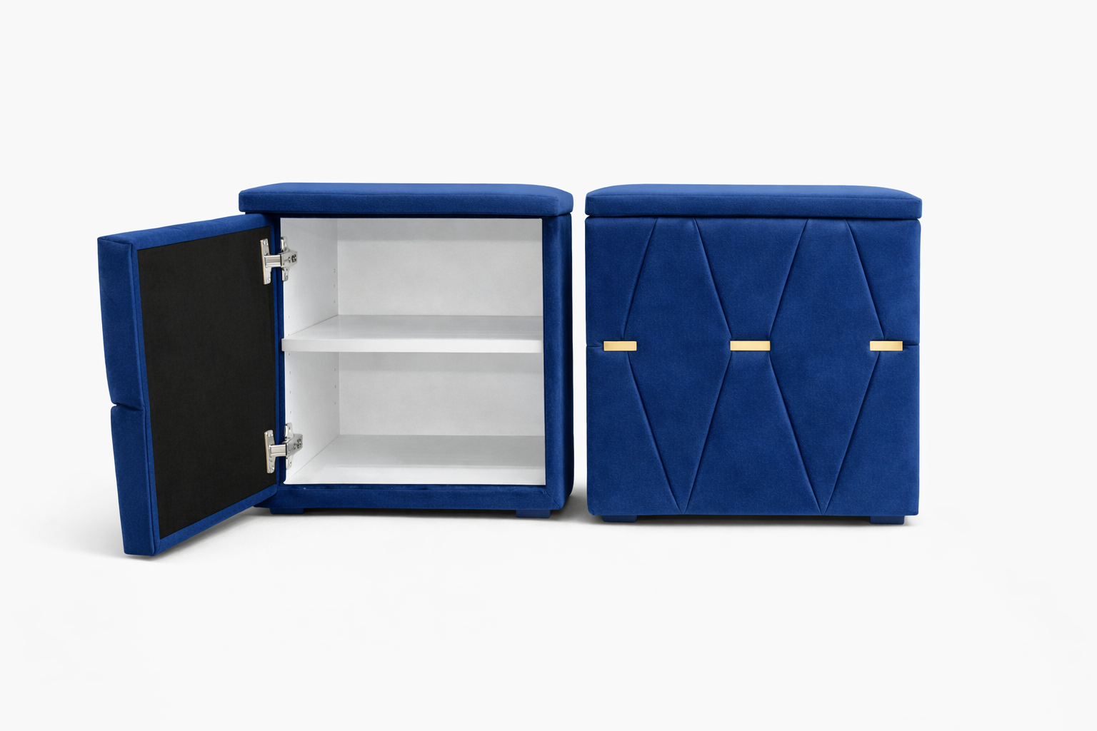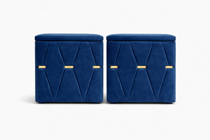 Elegante și rafinate, aceste noptiere tapițate cu stofă de înaltă calitate adaugă un plus de stil oricărui dormitor. Modelul geometric decorativ și accentele metalice aurii oferă un aspect sofisticat, iar structura solidă garantează durabilitate în timp.
