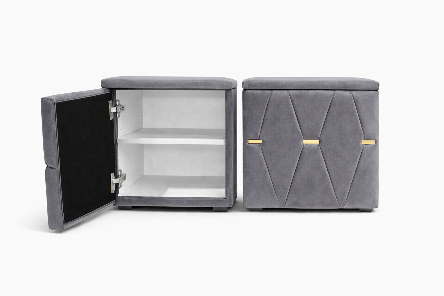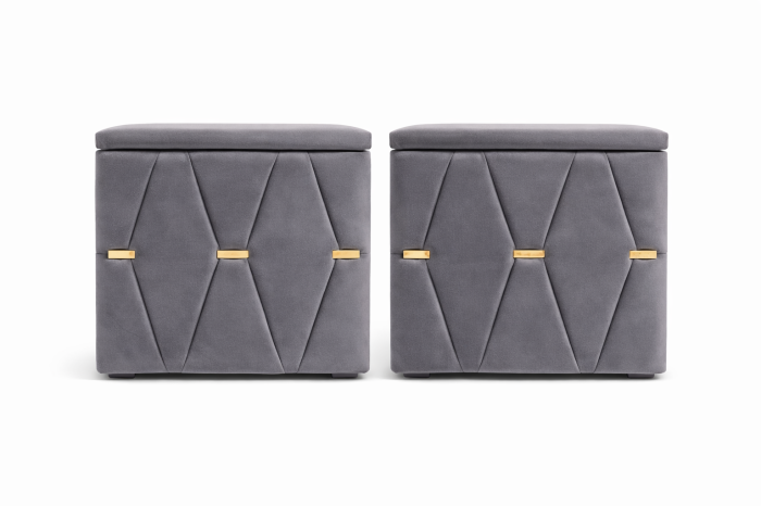 Elegante și rafinate, aceste noptiere tapițate cu stofă de înaltă calitate adaugă un plus de stil oricărui dormitor. Modelul geometric decorativ și accentele metalice aurii oferă un aspect sofisticat, iar structura solidă garantează durabilitate în timp.