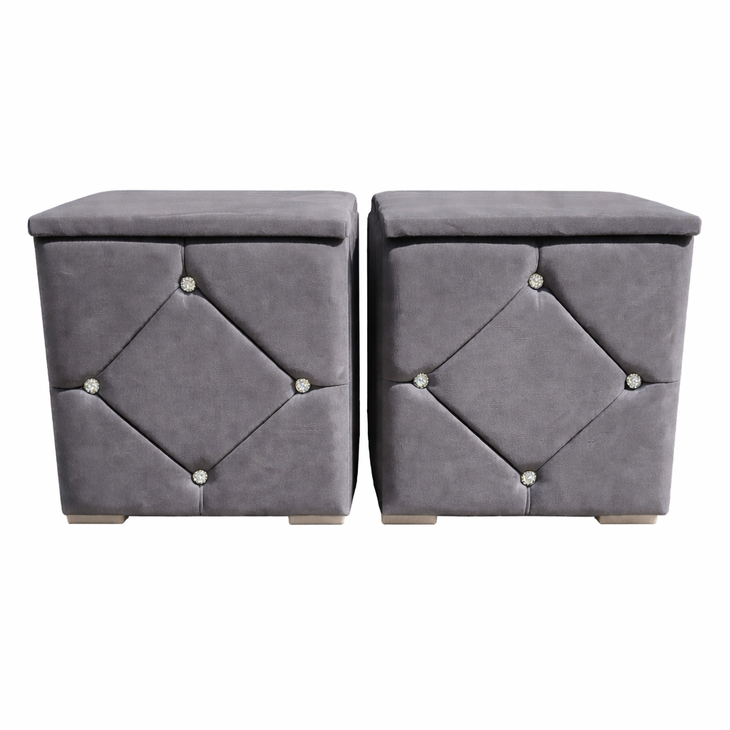 Elegante și rafinate, aceste noptiere tapițate cu stofă de înaltă calitate adaugă un plus de stil oricărui dormitor. Modelul geometric decorativ și accentele cu nasturi cristal oferă un aspect sofisticat, iar structura solidă garantează durabilitate în timp.