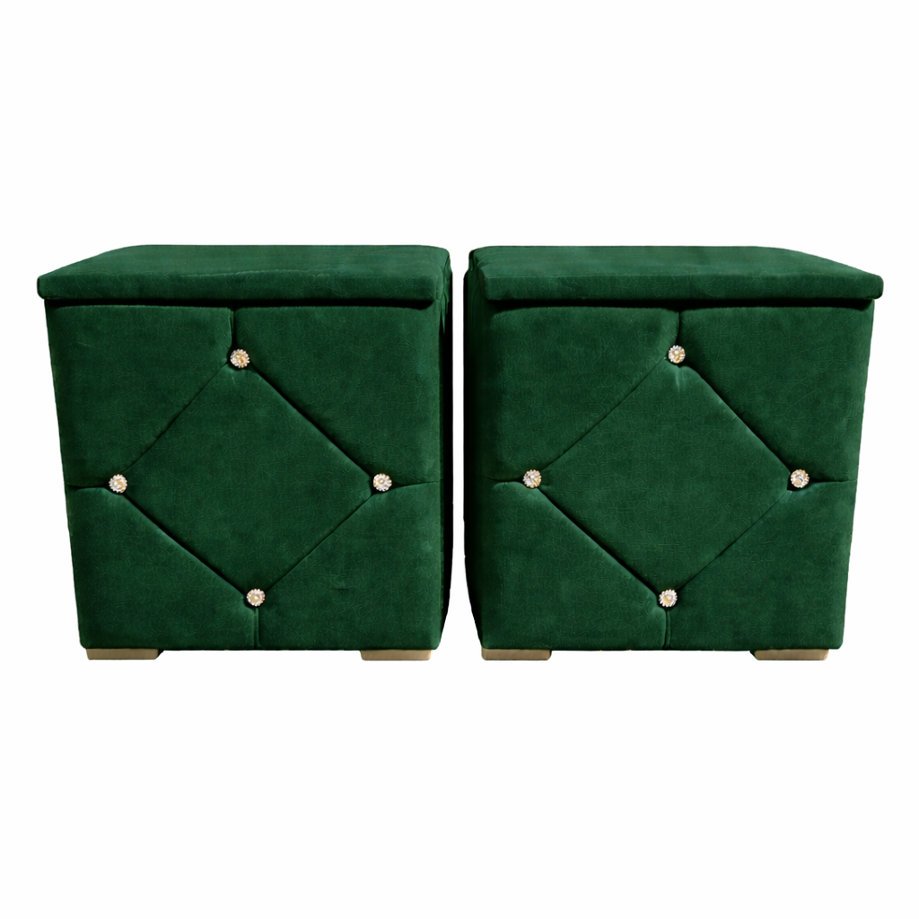 Elegante și rafinate, aceste noptiere tapițate cu stofă de înaltă calitate adaugă un plus de stil oricărui dormitor. Modelul geometric decorativ și accentele cu nasturi cristal oferă un aspect sofisticat, iar structura solidă garantează durabilitate în timp.