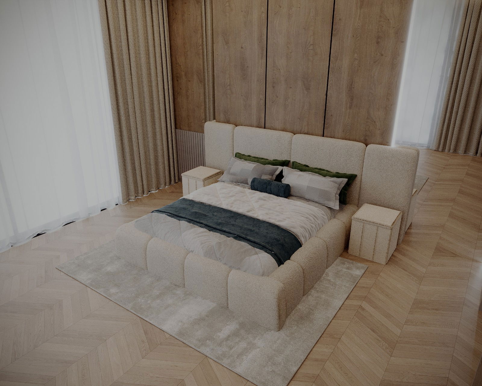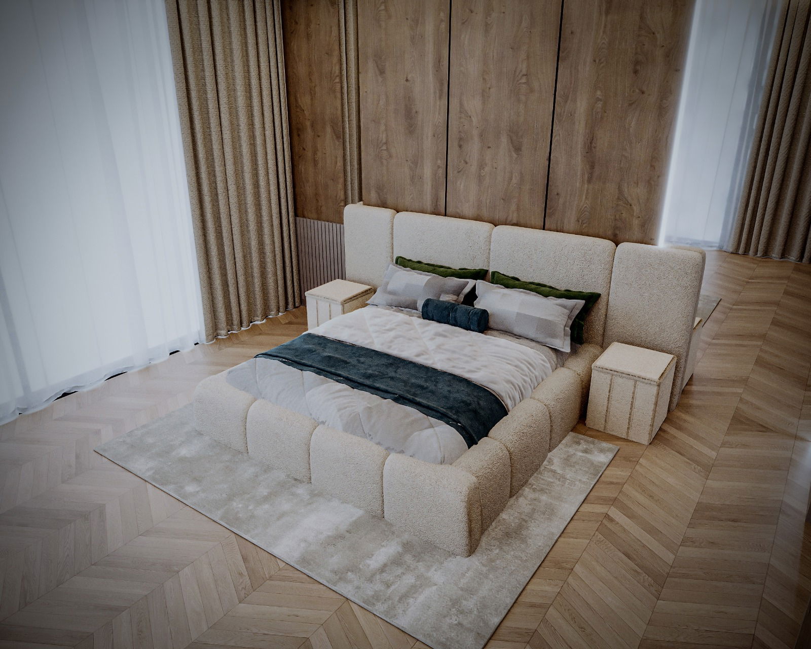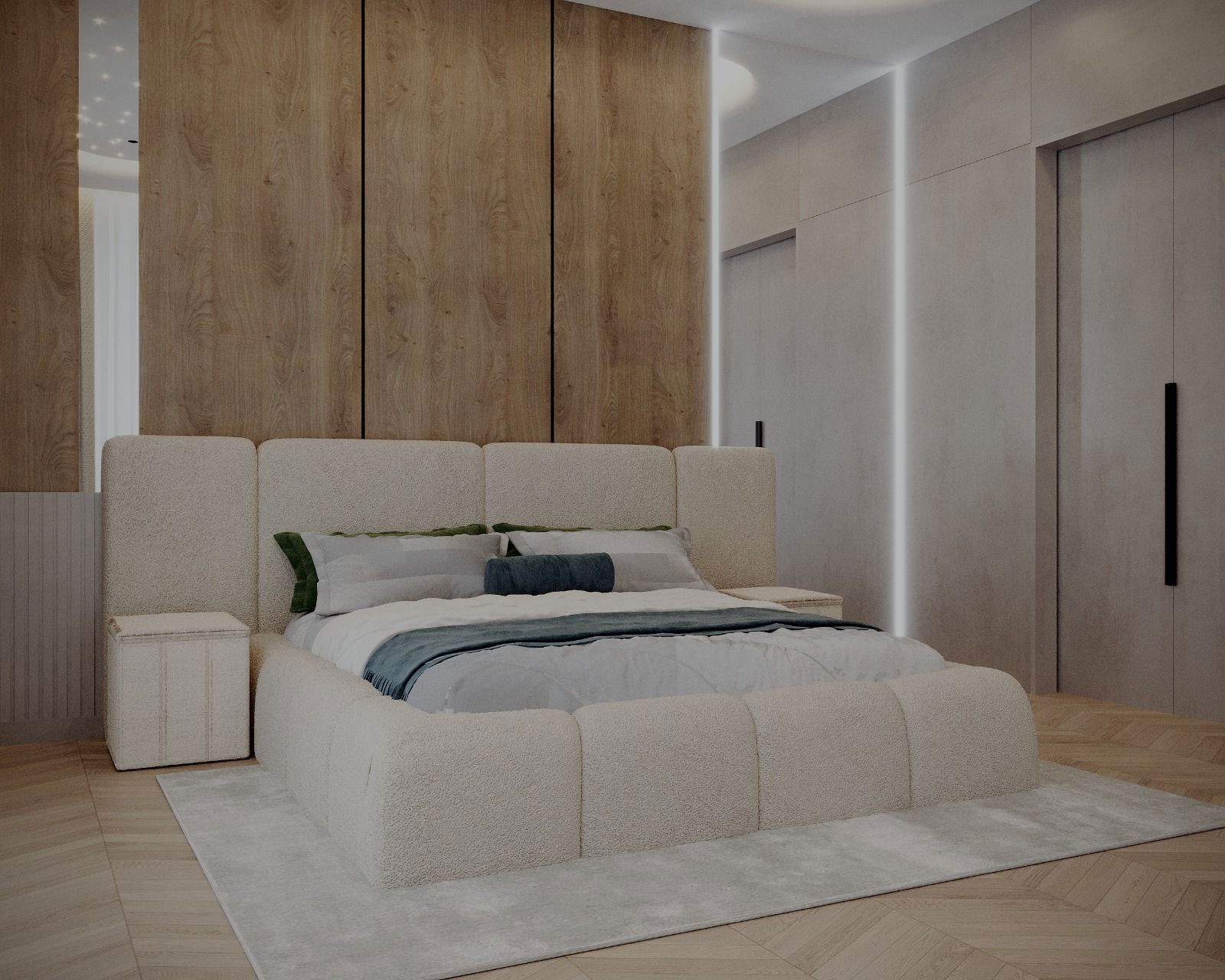 Acest pat tapițat impresionează prin designul modern și materialele de înaltă calitate,