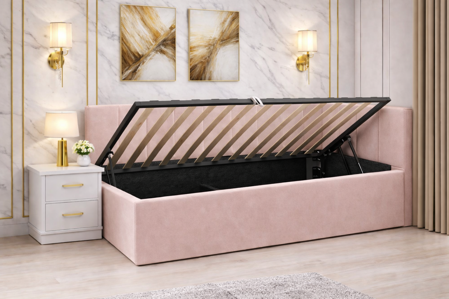 🛏️ Pat tapițat BUBU – design modern cu ladă de depozitare