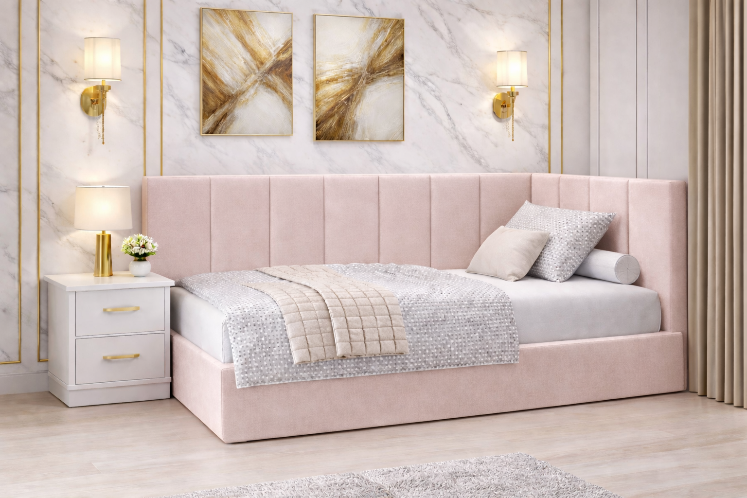 Tapițat în material catifelat, plăcut la atingere și disponibil în mai multe culori moderne, acest model oferă un plus de confort și stil dormitorului tău.