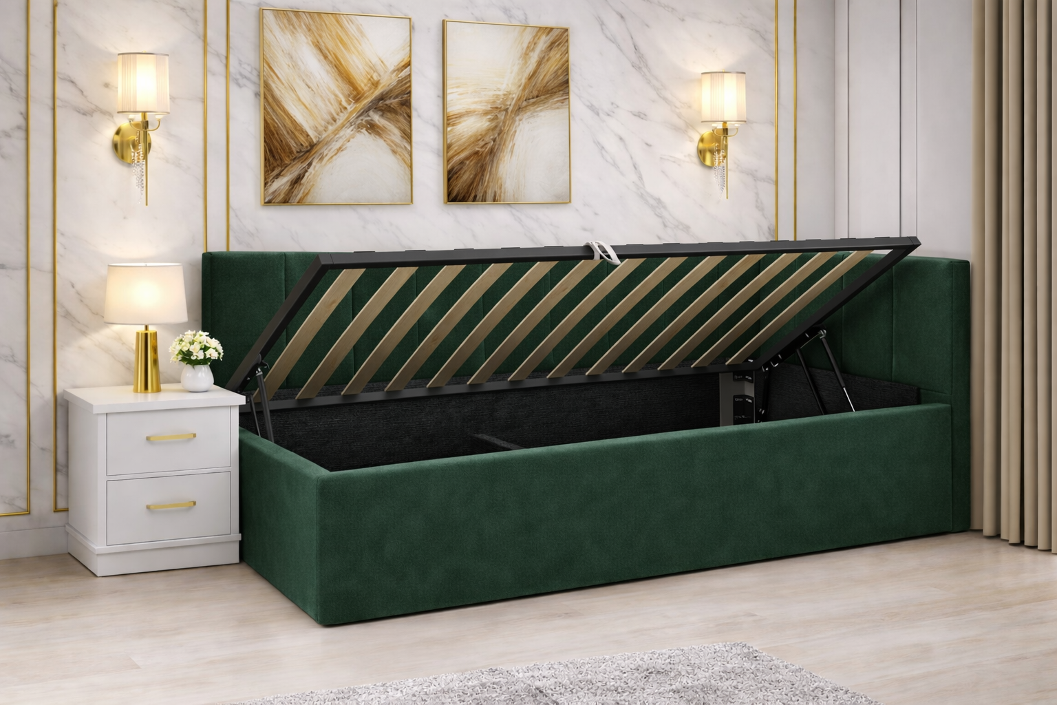Pat Tapitat Bubu cu Somiera Rabatabila si Lada de depozitare